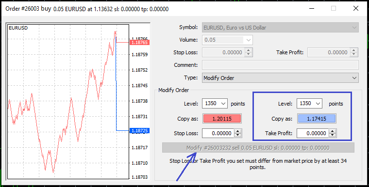 - আপনি চাইলে যেকোনো সময় নিজ ইচ্ছা মতন এই অর্ডার এর লেভেল পরিবর্তন করতে পারবেন। যেমন ধরুন, প্রথমে আপনি ৫০ পিপ্স এর প্রফিট লেভেল সেট করলেন এবং চিন্তা করছেন মার্কেট প্রাইস আরও প্রফিট প্রদান করবে সেক্ষেত্রে আপনি চাইলে সাথে সাথেই সেটিকে বাড়িয়ে কিংবা বিপরীত ক্ষেত্রে কমিয়ে নিতে পারবেন।